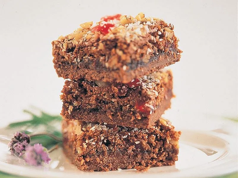 Lezzet yemek tarifleri özel günlerinizde yanınızda. Kek unu ve kakaoyu çukur bir kapta karıştırın. şeker ve oda sıcaklığında yumuşatılmış margarini ilave edin. Malzemeleri iyice yoğurup yumuşak kıvamlı bir hamur hazırlayın. 25x25 cm çapında bir tepsinin içine yağlı kağıtla döşeyip, elinizle bastırarak tepsiye yayın. Önceden ısıtılmış 180 dereceye ayarlı fırında 15 dakika pişirin. Dolgusunu hazırlamak için, yumurtalar ve şekeri krema kıvamına gelinceye kadar mikserle çırpın. Kek unu, kabartma tozu ve bir tutam tuzu ekleyip karıştırın. Ceviz içi, kiraz şekerlemesi ve hindistancevizini ekleyip tekrar karıştırın. Kalıbı fırından alıp hazırladığınız malzemeyi hamurun üzerine yayın. Tekrar fırında verip 20 dakika daha pişirin. Çikolatayı iri parçalara bölüp benmari usulü eritin ve sıcak kekin üzerine yayın. Çekilmiş ceviz içi, hindistancevizi ve kiraz şekerlemesi ile süsleyin. Soğumuş keki suyla ıslatılmış bir bıçakla karelere kesip servis yapın.