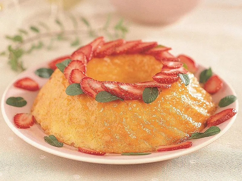 2 kahve fincanı toz şeker ve 2 çorba kaşığı suyu bir tavaya alın. Kısık ateşte karamel halini alıncaya kadar pişirin. Ortası delik bir kek kalıbına hazırladığınız karameli döküp fırça ile her tarafına yayın. Sütü ve portakal kabuğu rendesini tencereye alıp kaynatın. Pirinci bol suda birkaç kez yıkayıp süzün. Pirinç ve vanilyayı kaynamakta olan süte ekleyin. Kısık ateşte, pirinçler sütü tamamen çekinceye kadar sürekli karıştırarak pişirin. Muhallebi kıvamına gelince derin bir kaba boşaltın. Margarini ve kalan toz şekeri ilave edip hızla karıştırın ve ılınmaya bırakın. Yumurta sarılarını ekleyip tekrar karıştırın. Yumurta aklarını bir kaseye alıp tuz ekleyin ve kar haline gelinceye dek çırpın. Pirinçli karışıma ilave edip kaşıkla alttan yukarı doğru karıştırarak yedirin. Hazırladığınız karışımı kalıba dökün, üzerini kaşığın sırtı ile bastırarak düzeltin. Kalıbı içi kaynar su dolu bir başka kabın içine oturtun ve önceden ısıtılmış 200 dereceye ayarlı fırında (benmari usulü) pişirin. Kalıbı fırından çıkarıp kenarlarını bıçakla sıyırın ve servis tabağına ters çevirerek alın. Çilekleri dilimleyin. Kekin üzerini çilek dilimleri ve nane yapraklarıyla dekoratif şekilde süsleyin. Ilınınca dilimleyip servis yapın. Afiyet olsun.
