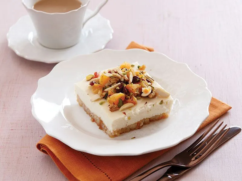 - Soğuduktan sonra üzerini küçük kesilmiş mevsim meyveleri, badem ve Antep fıstığıyla süsleyerek servis yapın.
