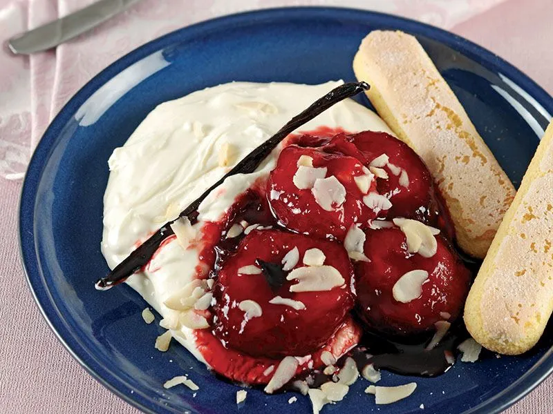 - Servis tabağına kremayı, üzerine de erikleri yerleştirip kedidili bisküvi ile servis yapın.