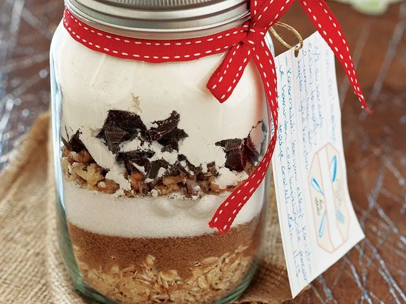 Sırasıyla ve bastırarak yulaf ezmesi, esmer şeker, vanilya, toz şeker, ceviz içi, çikolata, un, kabartma tozu, karbonat ve tuzu uygun boydaki bir kavanoza doldurun.