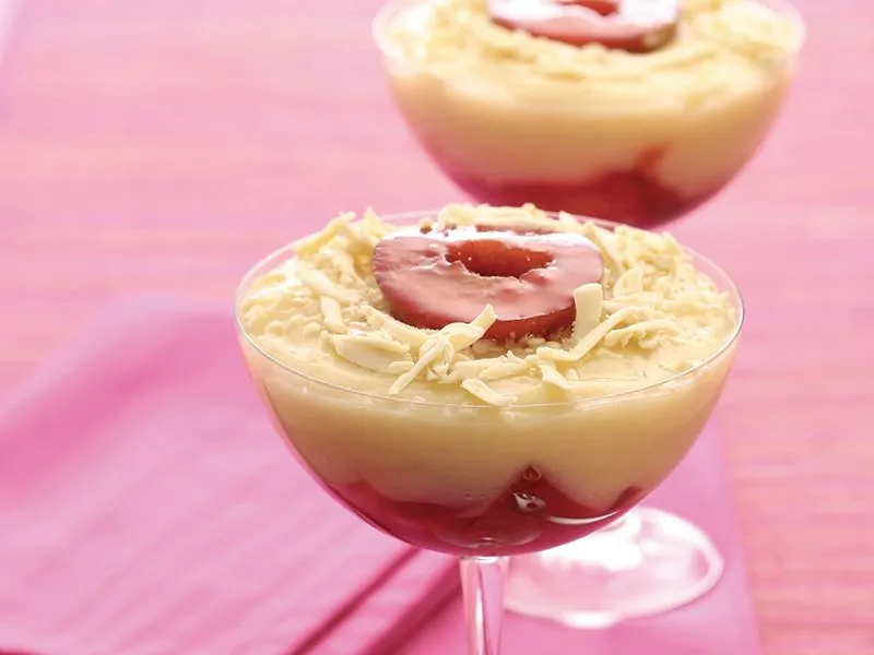Servis bardaklarına sırasıyla kırmızı erikli karışım ve ılınmış muhallebiyi paylaştırın.Üzerlerine ayırdığınız yarımşar erikleri yerleştirin.Rendelenmiş beyaz çikolata serpiştirin.Buzdolabında en az yarım saat soğutup servis yapın.