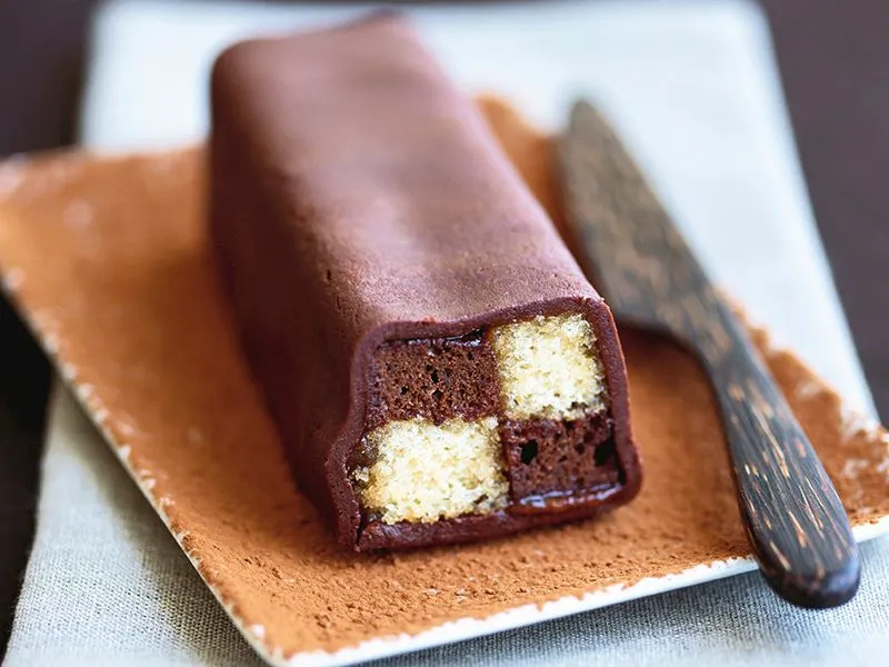 Kekler soğuyunca kalıplarından çıkarın ve tezgahın üzerinde keskin bir bıçakla boylamasına ortadan ikiye kesin.Sade ve kakaolu birer kek dilimini yanyana getirip üzerine ve yanlarına bol miktarda portakal veya kayısı marmeladı sürün.Kalan 2 kek dilimini değişimli olarak,yani sadenin üzerine kakaolu,kakaolunun üzerine sade kek gelecek şekilde yerleştirin.Üzerine ve yanlarınada portakal veya kayısı marmeladı sürün.