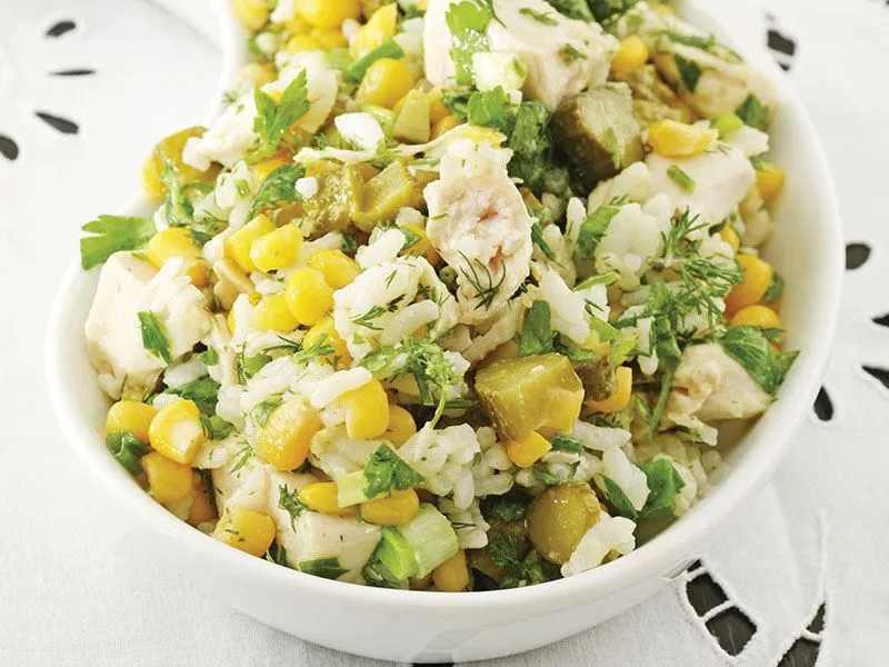 mısır salatası, tavuklu salata, salata tarifleri, pratik salata, kolay salata, doyurucu salata, misafir sofrası, meze tarifleri, yaz salatası, konserve mısır, tavuk göğsü, pirinçli salata, kornişon turşu, maydanoz, dereotu, taze soğan, limonlu salata, zeytinyağlı, hardallı salata, sağlıklı salataEkran görüntüsü al