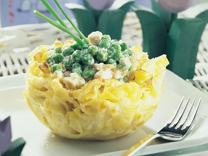 Lezzet çocuklarınız için de harika yemek tarifleri sunuyor. Şimdi başlayalım. Tereyağını eritin. Unu ekleyip kavurun. Sütü azar azar yedirerek ekleyin. Tuz, karabiber ve hindistancevizini ilave edip beşamel kıvamında olana kadar 10 dakika kısık ateşte pişirin. Soğanı soyup kıyın. Yağı tavada kızdırıp soğanı soteleyin. Bezelyeyi ilave edip karıştırın. Suyu ekleyip bezelyeler yumuşayana kadar pişirin. Hindi etini tavla zarı şeklinde doğrayıp bezelyeye ekleyin ve harmanlayın. Bezelyenin yarısını beşamele ekleyip karıştırın. Makarnayı tuzlu suda diri kıvamda haşlayın. Süzüp kalan beşamel sos, hafif çırpılmış yumurta ile peyniri ekleyip harmanlayın. 4 küçük ve derin fırın kalıbını yağlı kağıtla kaplayın. Makarnayı paylaştırıp orta kısımlarını çukurlaştırın. Önceden ısıtılmış 180 dereceye ayarlı fırında 15 dakika pişirin. Beşamelli bezelyeleri makarna yuvalarına paylaştırın. Servis tabağına alıp sıcak veya ılık servis yapın.