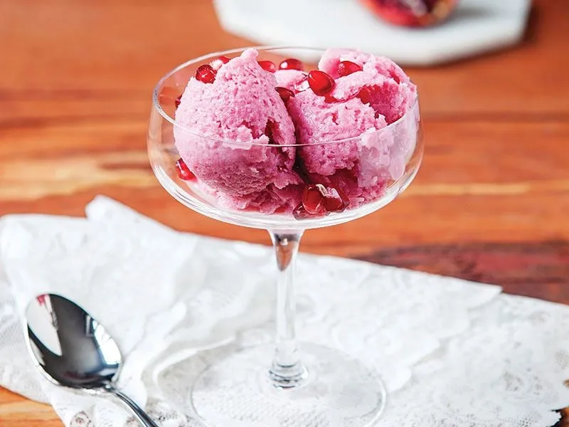 Nar suyu ve şekeri tencereye alın. Orta ateşte şeker eriyene kadar ısıtın. Limon suyunu ekleyip oda ısısına gelene kadar bekletin. Yoğurt, nar aromalı şurup ve şekerli nar suyunu bir kapta iyice karıştırın. Karışımı kapaklı çelik veya cam kaba aktarın. Buzlukta 5 saat bekletin. Beş saatin sonunda karışımı iyice karıştırın. Bu karıştırma işlemini her yarım saatte bir kez olmak üzere 6 kez tekrarlayın. Karışımı kapaklı kapta 5 saat bekletin. Sonrasında kaşıkla şekillendirip servis yapın.