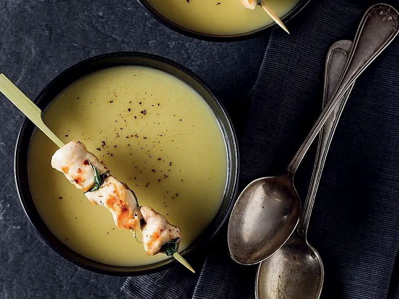 Yemeklik doğradığınız soğanı tereyağında pembeleşinceye kadar soteleyin. İri doğradığınız patates ve pırasayı ilave edip tuz ve baharatlarla tatlandırın. Tavuk suyunu ilave edip kaynatın. Kaynamaya başladıktan sonra ocağın altını kısın. Sebzeler yumuşayıncaya kadar pişirip ocaktan alın ve pürüzsüz bir kıvam elde edinceye kadar blenderdan geçirin. Krema ve ince kıydığınız taze adaçayını ilave edip bir taşım daha kaynatın. Tavuk şişler için kuşbaşı tavuk etlerini yayvan bir kaba alın. Üzerine zeytinyağı gezdirip tuz ve karabiberle tatlandırın. Kuşbaşı tavuk etlerini şişlere dizip yapışmaz yüzeyli bir tavada kızartın. Çorbanızı yanında tavuk şiş ile birlikte sıcak servis yapın.