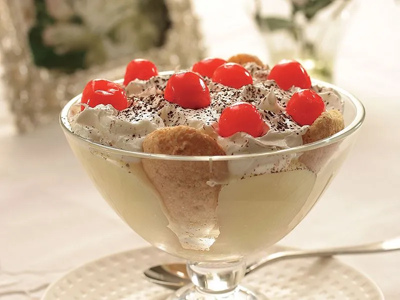 - Kuplara paylaştırıp üzerini kiraz şekerlemeleriyle süsleyin ve kakao serpin.