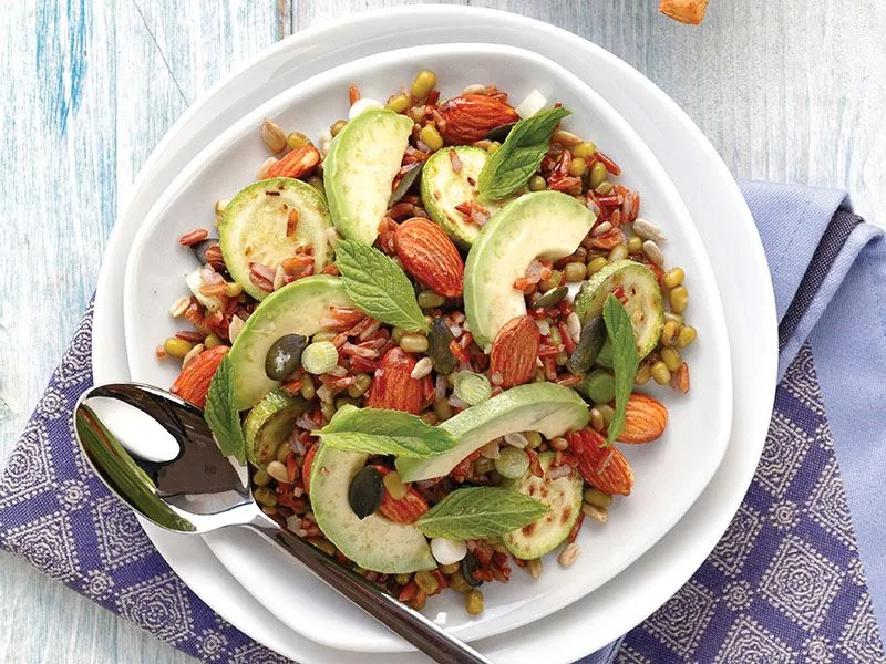 Maş fasulyesi ve kabuklu pirinci haşlayıp suyunu süzün ve bir kapta harmanlayın. Ayçekirdeği ve kabak çekirdeği ile bademleri tavada birkaç dakika kavurup pirince ekleyin. Kabakları ince doğrayıp 2 yemek kaşığı zeytinyağında soteleyin. Soğanları temizleyerek ince doğrayın ve hepsini harmanlayın. Zeytinyağı, limon suyu, bal, tuz ve karabiberi karıştırın. Avokadonun kabuğunu soyup ince doğrayın ve salatanın üzerine dizin. Limonlu sosu üzerine gezdirip nane yapraklarını ekleyin. Servis yapın.