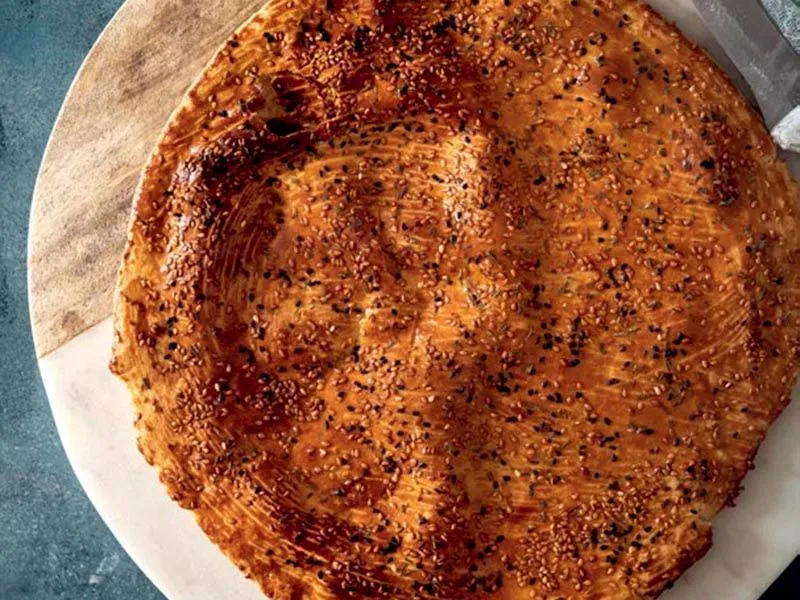 - Hamurun üzerine yumurta sarısı sürün, kıyılmış taze biberiyeyi, susamı ve çörek otunu serpin.