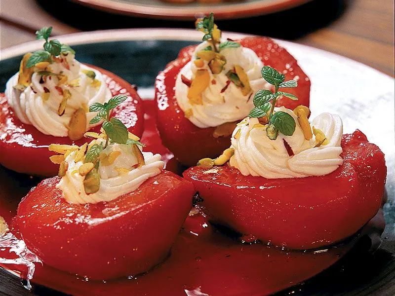- Ayvaların ortasını krema ile doldurup fıstık ve taze nane ile süsleyin.