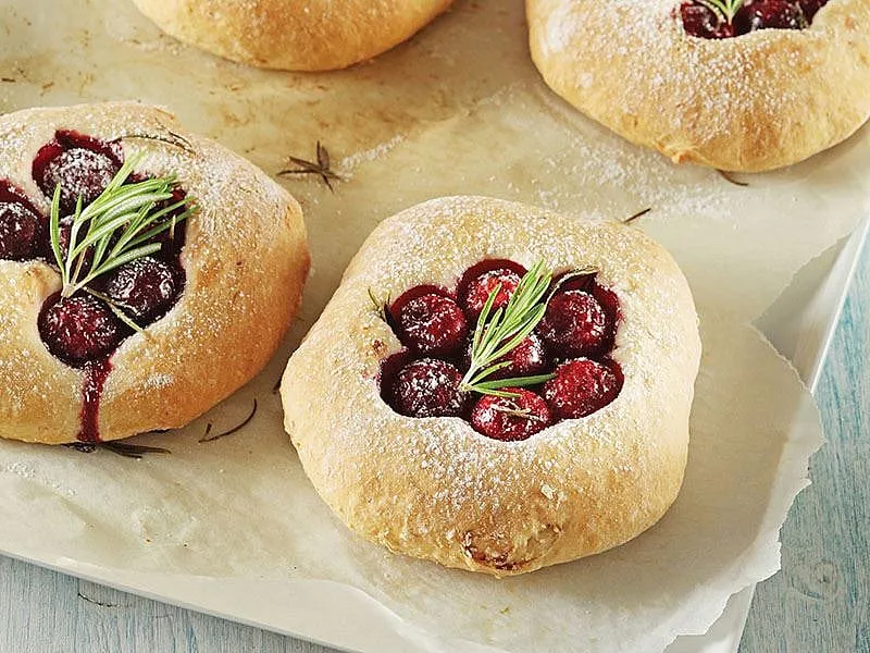Un, maya, tuz ve şekeri geniş bir kapta harmanlayın. Suyu ekleyip yoğurun. Ele yapışmayan, yumuşak bir kıvam için gerekirse un veya su ilavesi yapın. Üzerini örterek 1 saat mayalanmaya bırakın. Hamurdan parçalar kopartıp elinizle bastırarak yassı şekil verin ve yağlı kağıt serili tepsiye dizin. 10 dakika beklettikten sonra vişne ve biberiye yapraklarını üzerlerine yerleştirin. 200 dereceye ayarlanmış fırında kızarıncaya kadar pişirin. Fırından çıkarttıktan sonra isteğe göre pudra şeker serpiştirerek servis yapın.